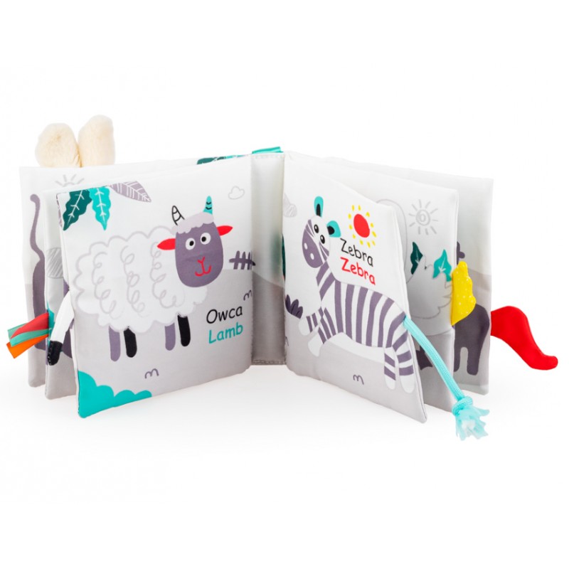 Na kartach tej materiałowej książeczki ukryły się różne wiejskie zwierzątka, a każdemu z nich wystaje poza obręb strony ogonek!
