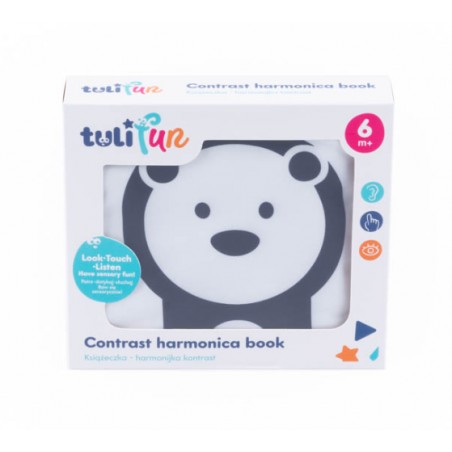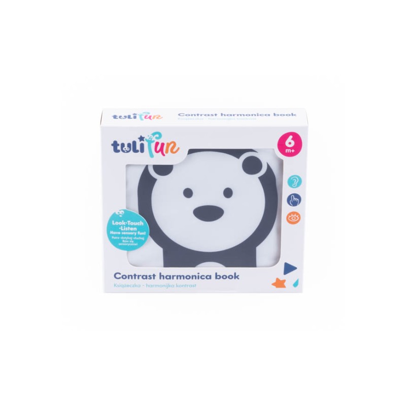 Materiałowa książeczka kryje w sobie wiele kontrastowych obrazków, które stymulują zmysł wzroku malucha.
