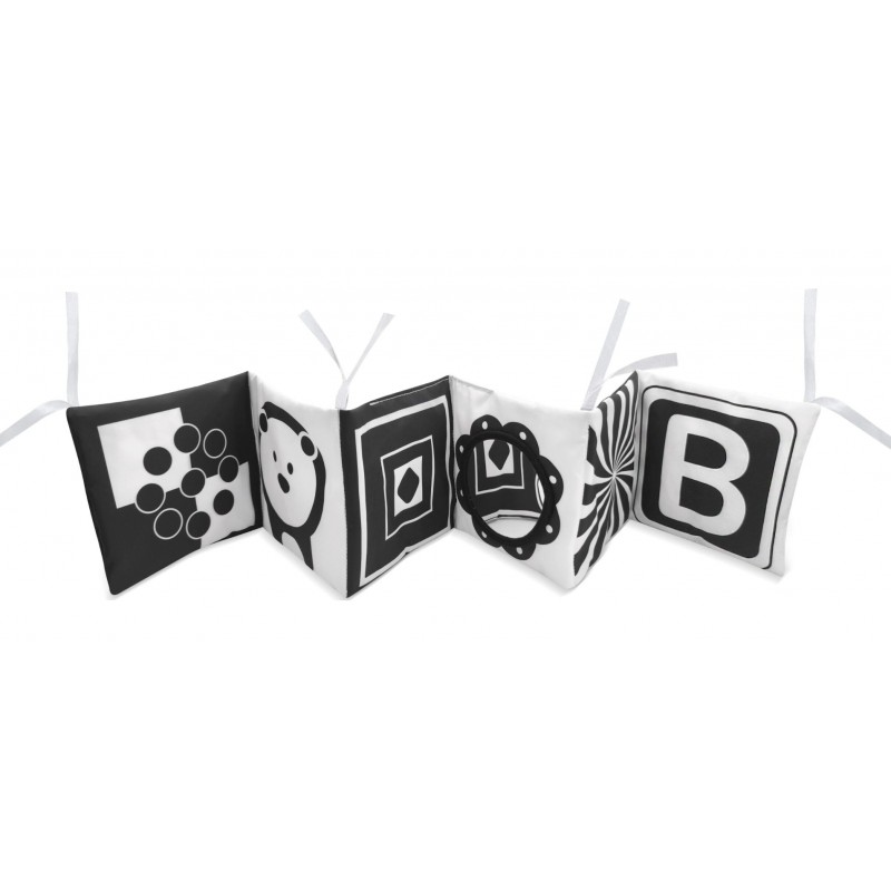 z szeleszczącego materiału, co stymuluje zmysł dotyku i słuchu najmłodszych. Praktyczne troczki pozwolą przymocować książeczkę do szczebelków dziecięcego łóżeczka.