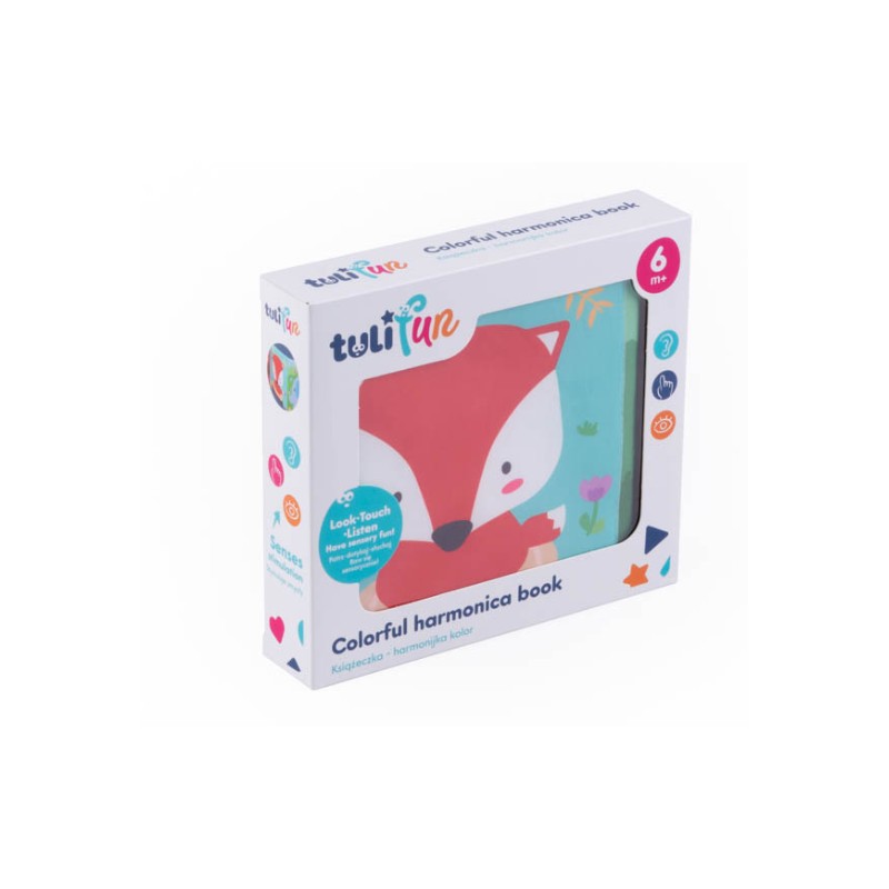 Z jednej strony harmonijki znajdują się urocze zwierzątka, a z drugiej, pojazdy. Poszczególne strony książeczki wykonane zostały z szeleszczącego materiału, dzięki czemu stymuluje ona zmysł dotyku i słuchu najmłodszych. Książeczka wyposażona została w praktyczne troczki, które pozwalają na przywiązanie jej do dziecięcego łóżeczka.