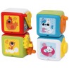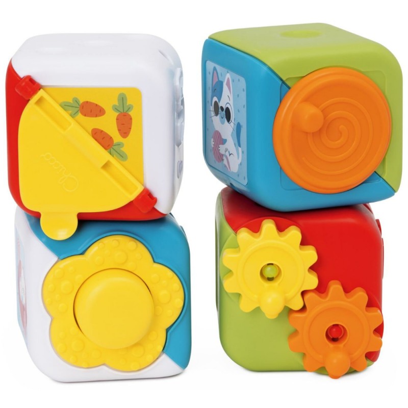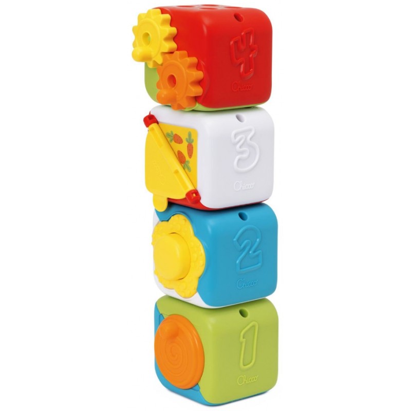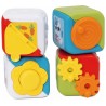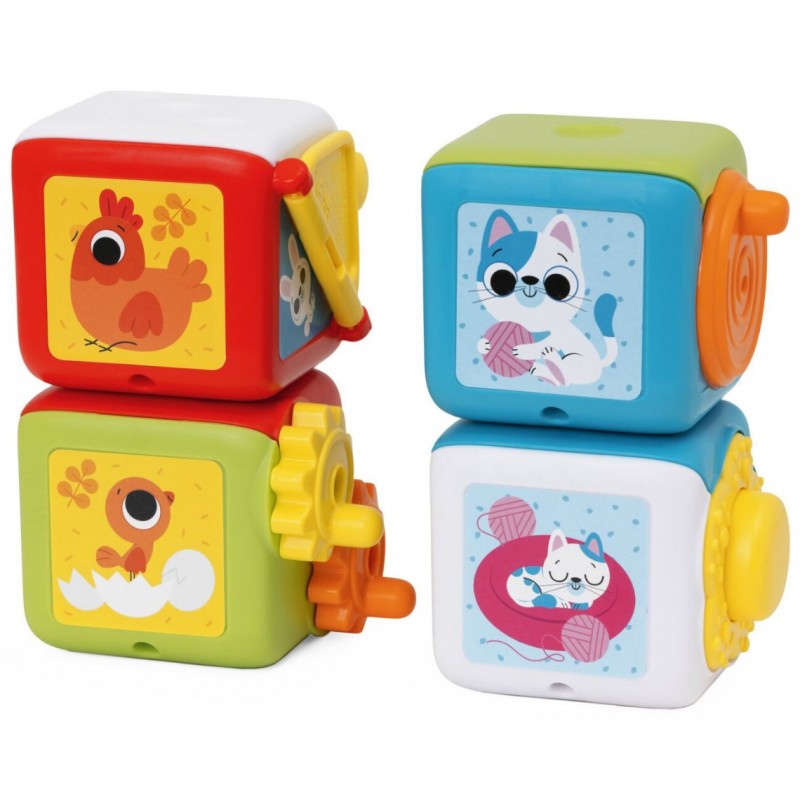 Poznaj Wielofunkcyjne Kostki Edukacyjne, zestaw czterech kolorowych kostek zaprojektowanych z myślą o kompleksowym rozwoju zdolności manualnych i logicznych Twojego dziecka.