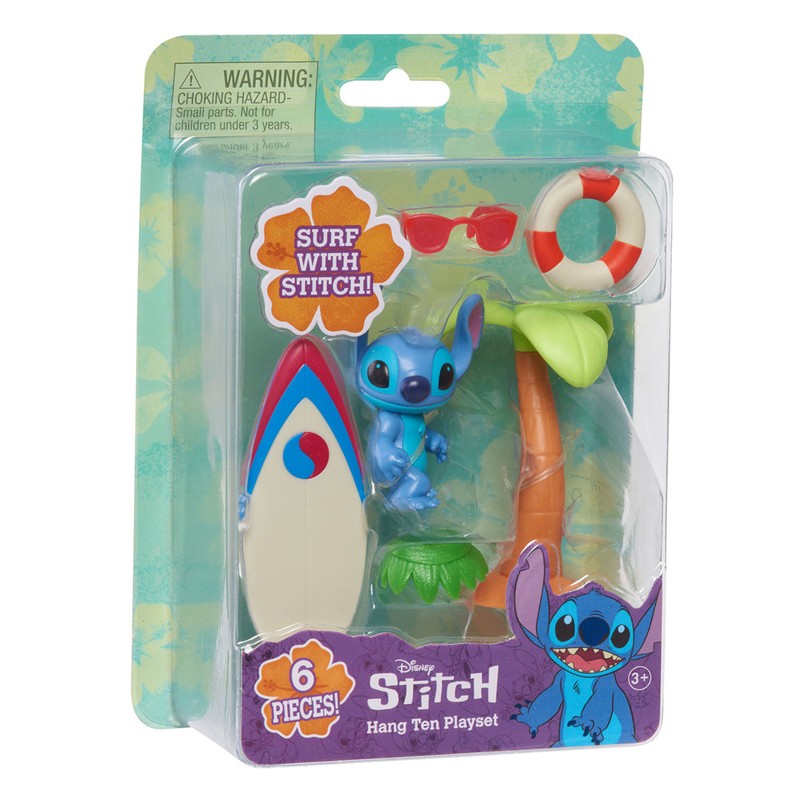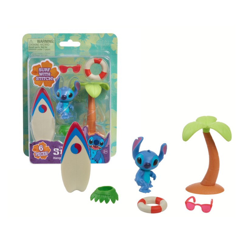 Ten 6-elementowy zestaw zawiera 5 cm figurkę Stitcha w stroju plażowym, deskę surfingową i trzy akcesoria do zabawy.