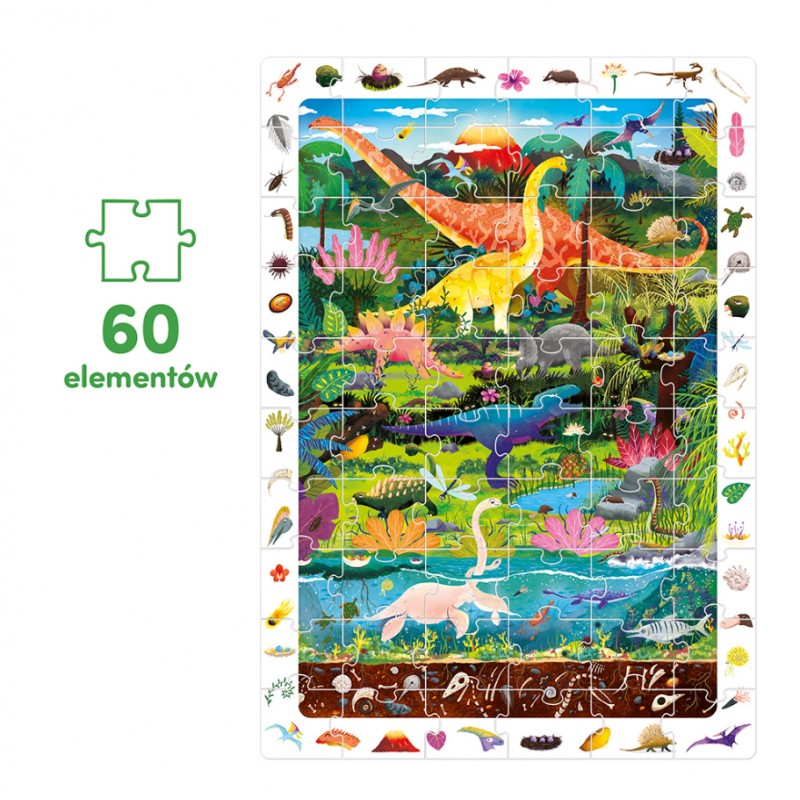 Bajecznie kolorowa, pełna szczegółów ilustracja przedstawia przeróżne dinozaury i inne zwierzęta. Na ramce układanki umieściliśmy mnóstwo detali do wyszukania na ilustracji. Do zestawu dołączyliśmy duży plakat pełen inspirujących ciekawostek dla wszystkich dzieci żądnych wiedzy o dinozaurach i przyszłych paleontologów. To doskonały pomysł na prezent dla przedszkolaka.