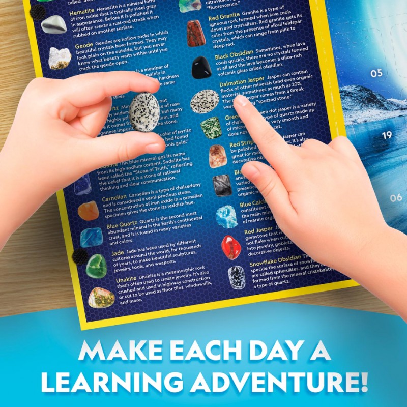 Ten niezwykły kalendarz adwentowy dla pasjonatów nauki o skałach i minerałach zawiera 24 okazy prawdziwych kamieni szlachetnych. Dzieci znajdą tu kwarc różowy, karneol, tygrysie oko, kawałek geody, niebieski kalcyt, różne formy jaspisu i wiele innych okazów! A w dodatku ostatniego dnia odkryją niezwykłą niespodziankę i będą mogły pobawić się w geologów, wydobywając kolejny klejnot z załączonej bryły!