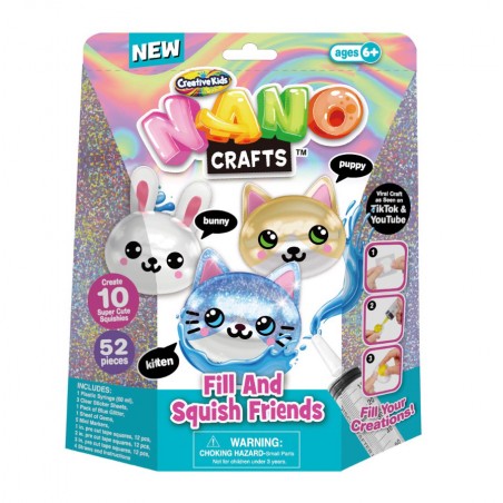 Po uformowaniu, ożywają dzięki wyraźnym oczom i naklejkom na usta z różowymi policzkami. Zestaw pozwala na stworzenie do 10 super słodkich squishies. Nano Crafts to kolejny wielki trend w rzemiośle. Używając taśmy nano, zestawy Nano Crafts tworzą przyjemne, łatwe do wykonania rękodzieła, od błyszczących baniek po miękkie kostki z ulubionymi postaciami.